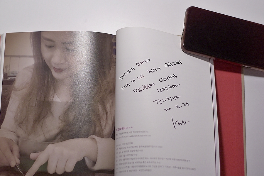 몇 개의 팸플릿과 4.3에 대해 알리고자 만들어진 소책자, 그리고 전시회의 모든 작품이 수록된 도록 (현장에는 기획자님과 보릿대 작품의 이수진 작가님이 나와계셨는데, 특별히 색시가 사인을 부탁해서 이수진 작가님이 도록에 글을 남겨주셨네요. "아는 것이 힘이다. 제주 4.3의 진실이 있는 그대로 많은 분들께 알려지기를 소망하며.." 라구요.)과 보릿대 넣어서 동백꽃을 형상화한 열쇠고리와 가방 등에 꽂아 다닐 수 있는 동백꽃 브로치를 가져왔습니다.