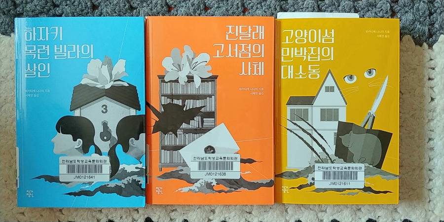 「하자키 목련 빌라의 살인」, 「진달래 고서점의 사체」, 「고양이섬 민박집의 대소동」