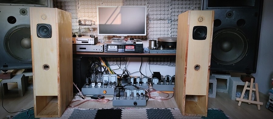 생각보다 앰프 매칭이 어렵다고 생각이 들더군요. 역시 앞에 언급한 고뇌님이 만들어주신 2와트 출력의 6S19P란 파워가 현재 유휴중이라 6SN7 프리와 같이 매칭을 하니 드디어 어느 정도 제대로 된 소리를 들려준다는 느낌이 들어서 청음은 이 조합에서 들었고 녹음을 했습니다.