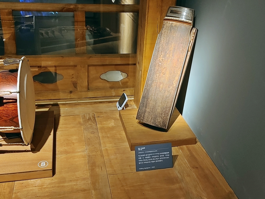 무형유산원 상설 전시관에 잠시 들러봤는데, 절금이라는 반으로 접는 휴대용 가야금이 보이더라구요. 신기해서 찍어봤습니다. 첨 보는거라..