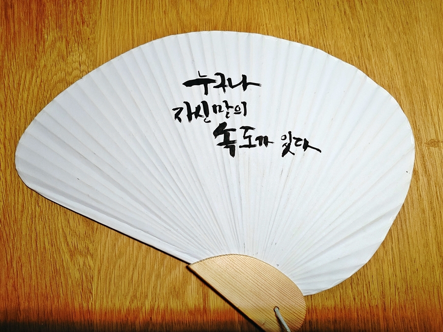 부채에 색칠하기 행사 코너에서 글을 선택하면 뒷면에 애들에게 전래동화 얘기해주고 하시는 여사님이 직접 글을 써주셨는데 색시가 선택한 글 귀 '꽃을 보듯 너를 본다'