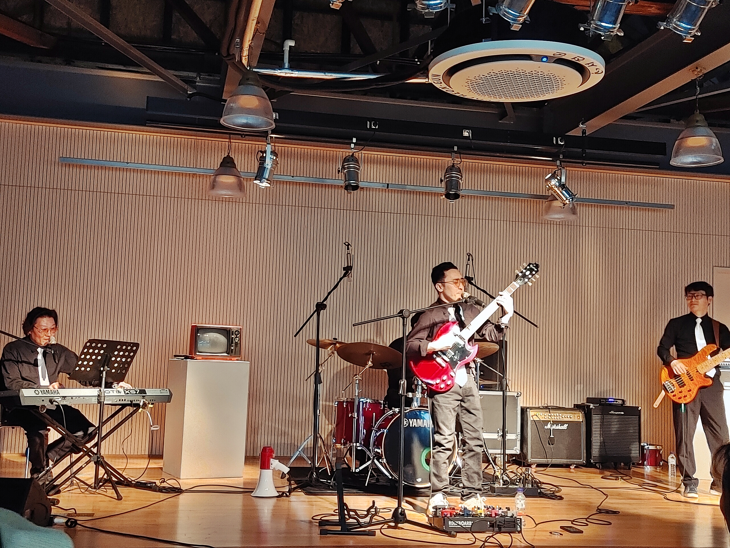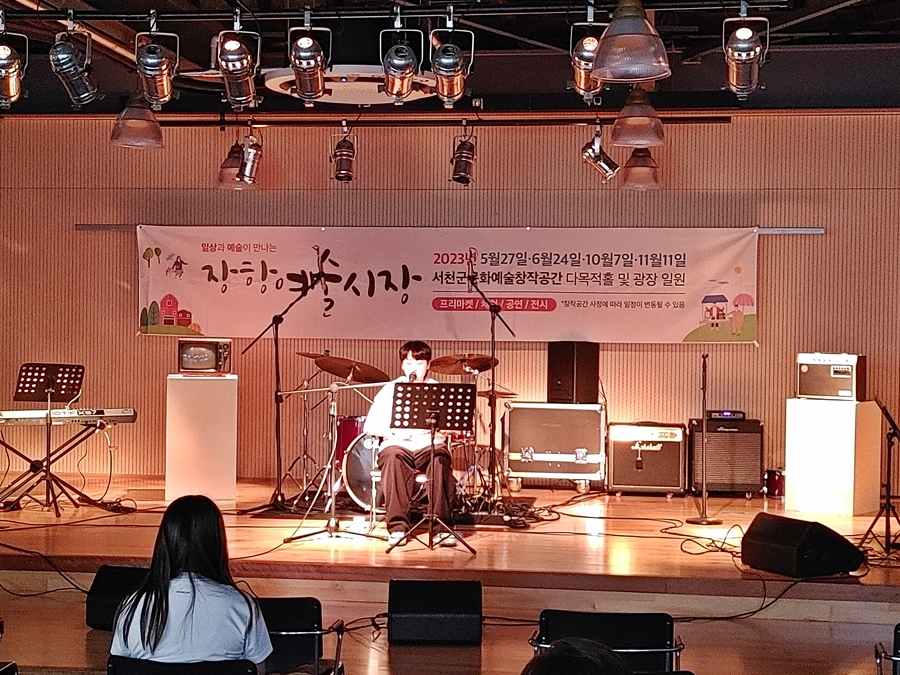 옛날 장항읍의 항구에 있던 미곡창고를 개조한 공간 <스페이스 미곡> 안에서 4시부터 'Y2Y'라는 여성 보컬과 남성 키보드 듀오의 공연이 진행되고 있었고, 들어갔을 때 보컬분께서 이소라의 노래를 열창하고 계셨다. 공간이 트인 공간이고 좌석도 몇 개 안 되는 곳이어서 음향적인 걱정을 했는데, 의외로 소리의 벙벙 거리는 울림도 없고, 보컬의 가사 전달력도 좋아서 꽤 만족스러웠다. 이것은 5시에 진행된 '콩코드'의 공연에서도 마찬가지였는데 단단한 드럼소리와 악기 간 소리의 퍼짐과 충돌이 없는 좋은 사운드는 공연 보는 내내 감탄을 자아냈다. 이런저런 공연장에서 이런 소리 듣기도 쉽지 않거니와 록 공연에서 모든 소리들이 퍼짐 없이 내 귀에 전달되는 음향이라니.. 만족 만족!! 오픈 공간이지만 음향 콘솔이 있고 음향 감독님도 계시던데 공간 설계부터 꽤 신경을 썼구나 하는 생각을 했다.