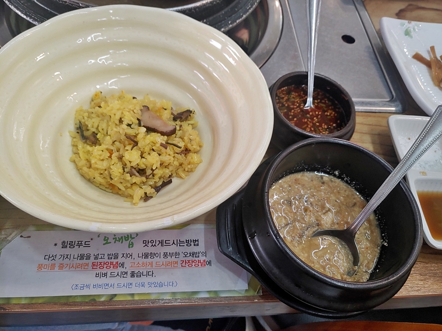 다 먹다가 밥 달라고 하면 오채밥이라고 저렇게 줍니다. 양념장이 두 가지가 나오는데.. 색시는 오리 먹고 배부르다고 안먹겠다고해서 제가 간장 비벼서 한 그릇 먹고, 된장양념으로 비벼서 한 그릇 먹고 했습니다..ㅋ