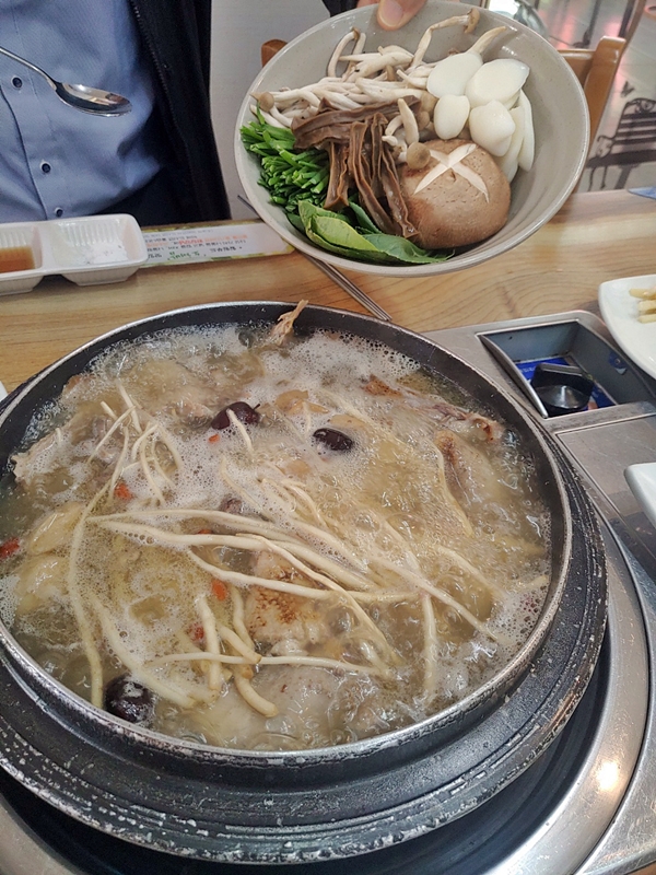 야채 투하.. 반마리 백숙인듯한데 실한 몸통쪽 고기들도 있고, 다리쪽도 2개 있었던듯.. 색시가 맛나게 촵촵...