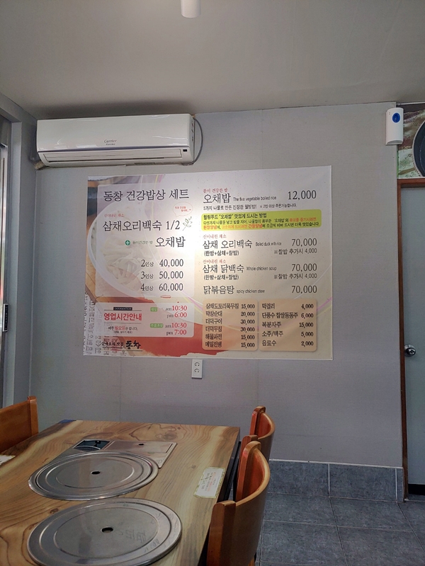 메뉴는 더 있겠지만.. 벽에 붙여놓은 사진에서 저희는 삼채 오리백숙 1/2 + 오채밥 2인 메뉴를 주문했습니다. 금액은 4만원이구요. 요즘 물가가 살인적이라 둘이서 오리백숙 4만원이면 나쁘지 않다고 생각되네요.