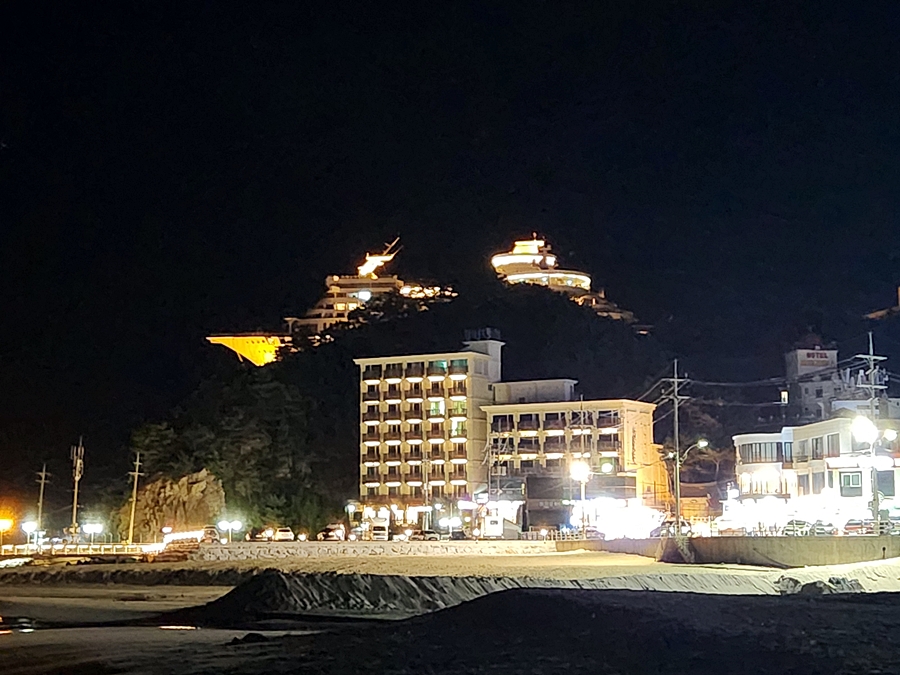 창을 열고 바라보는 동해 바다 밤 풍경 - 낮에는 잔잔하다가 밤이 되니 파도가 많이 치는 듯..
