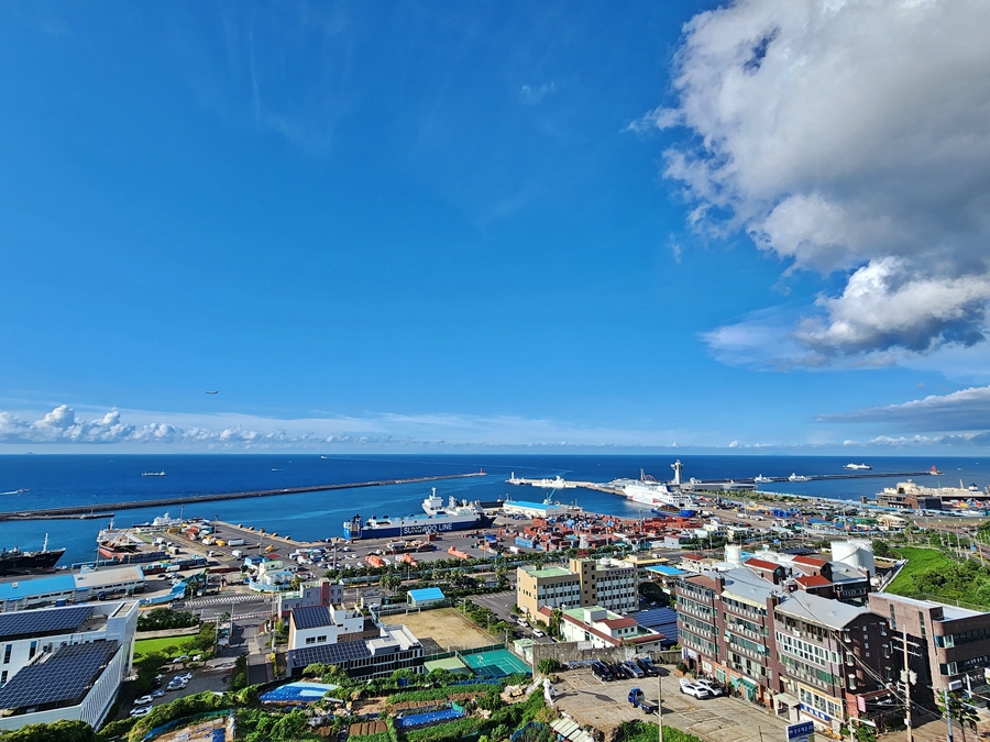 몇 년 전에 걸어서 구경도 가보고 했던 사라봉 등대가 우측 하단에 보입니다. (녹색 숲속 사이에 흰 등대)